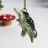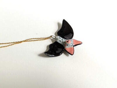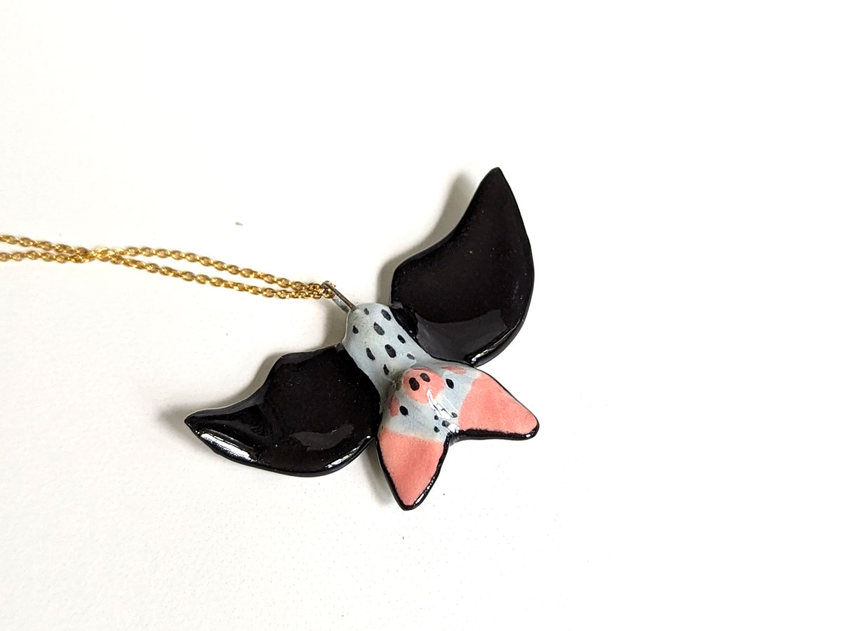 Ce pendentif représente une petite chauve souris en position tête en bas et ailes déployées. Comme si elle venait de se réveiller et s’apprétait à s’envoler vers de nouvelles aventures nocturnes. Avec sa robe grise aux détails noirs et rose, ce bijou de porcelaine est une pièce unique conçue et réalisée à la main à Montréal. La chaîne est vendue séparément.