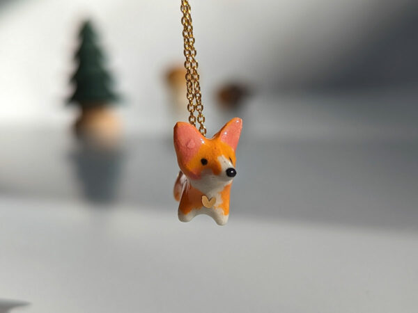 Comme tous les pendentifs uniques, ce petit corgi vient dans une boîte illustrée par mes soins au moment de l’envoi.