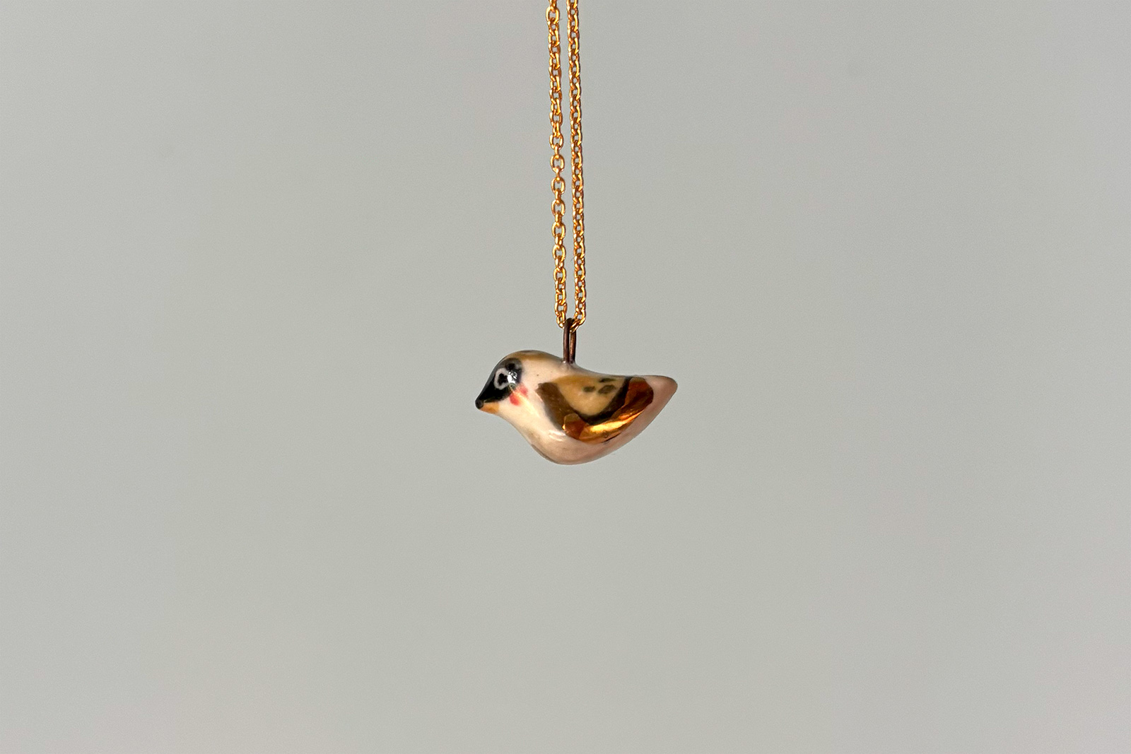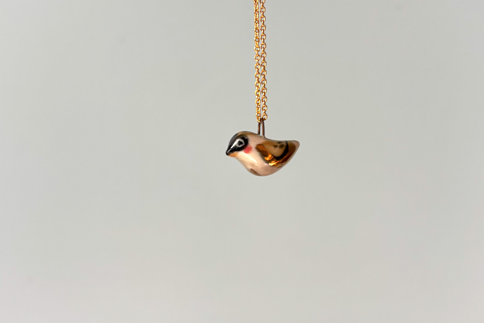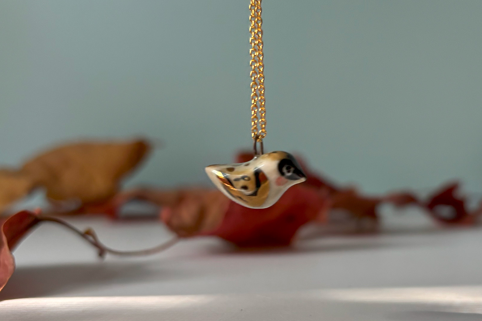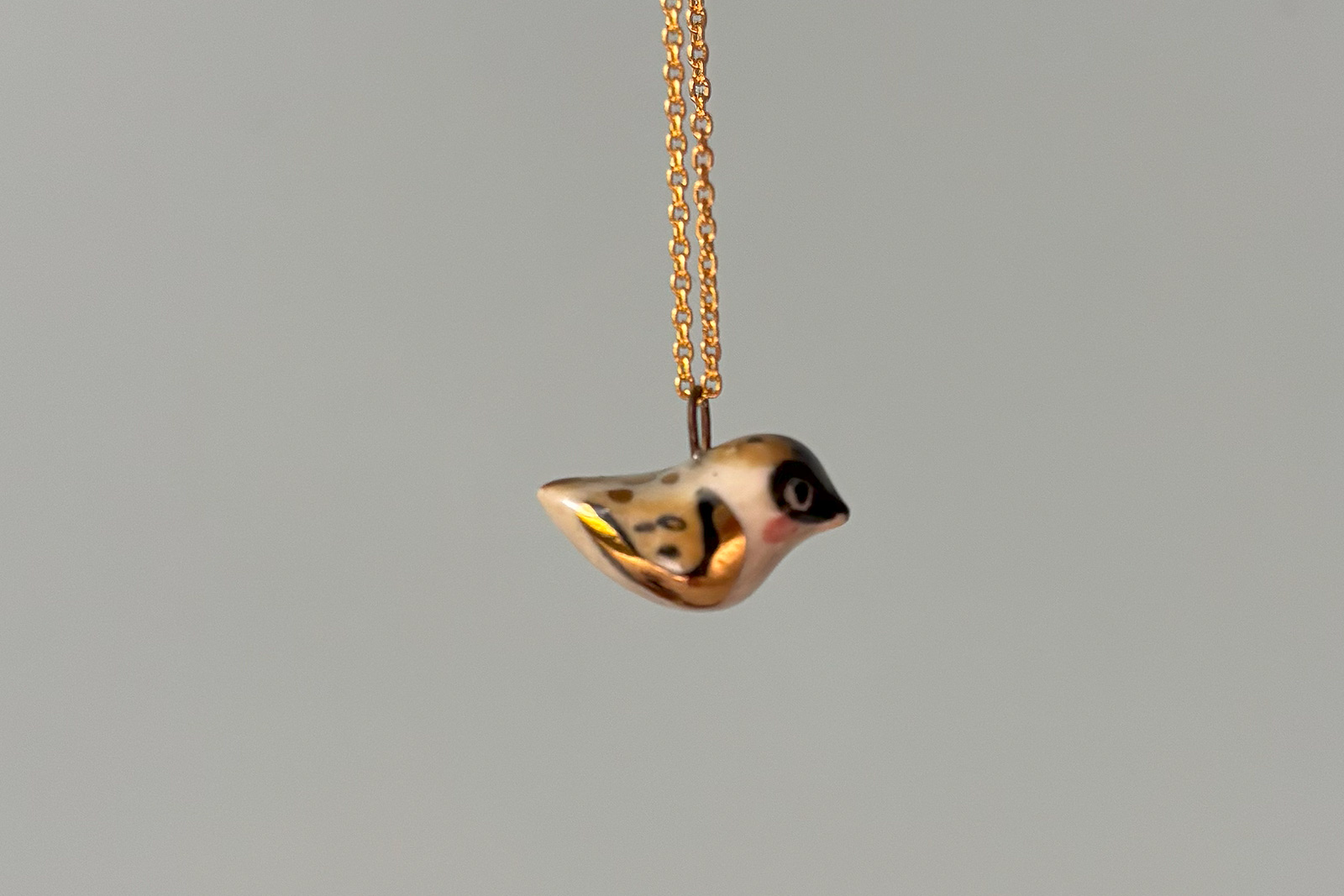 Pendentif de moineau mignon en porcelaine avec décor à l’or fin. Chaîne non inclue, pièce unique.
