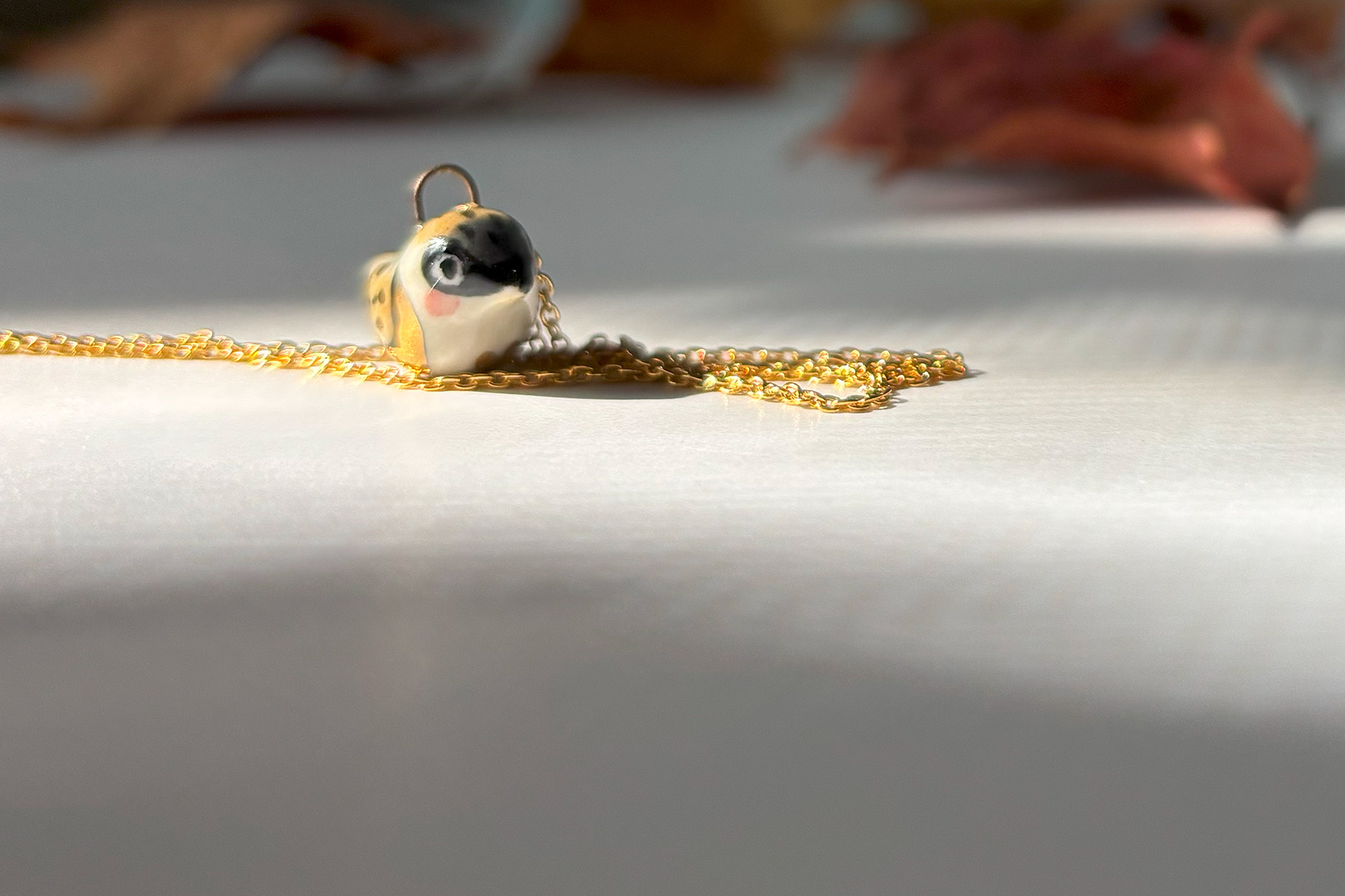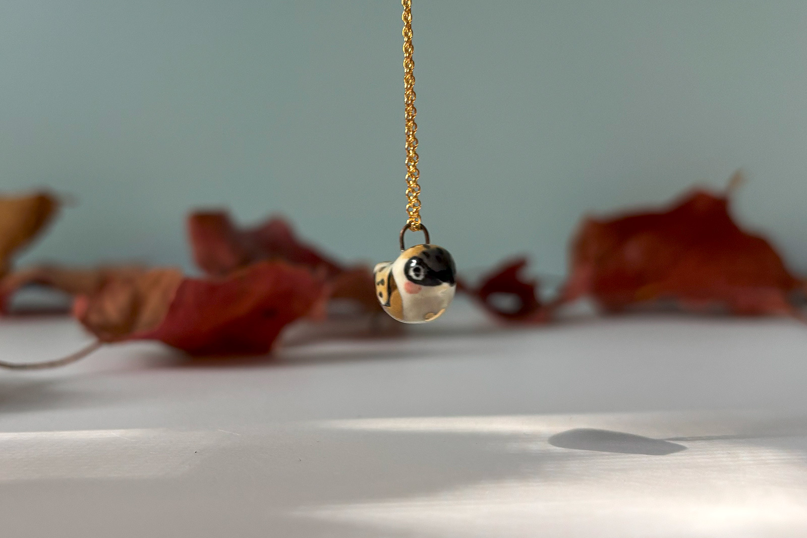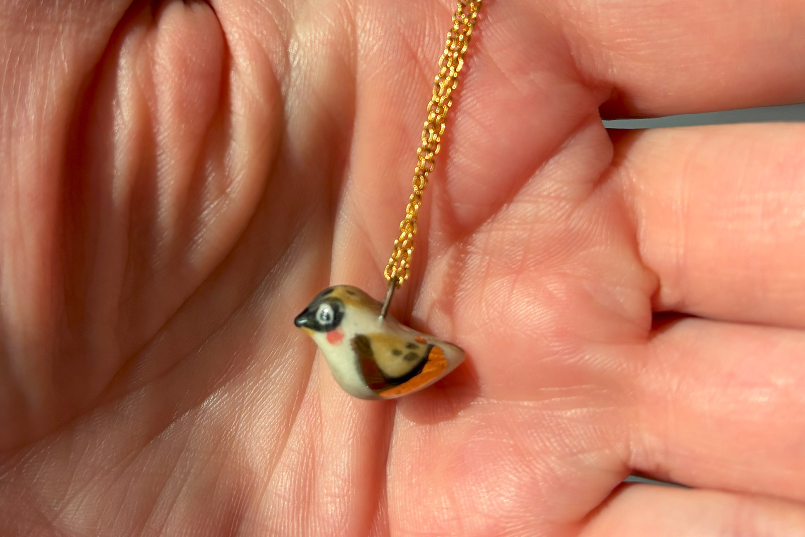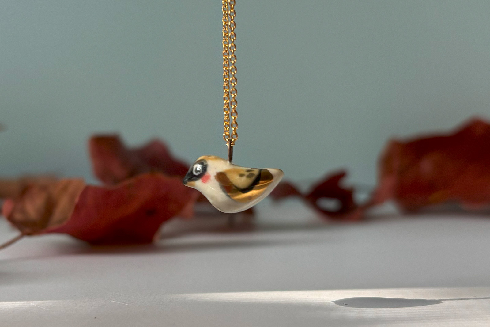 Pendentif de moineau mignon en porcelaine avec décor à l’or fin. Chaîne non inclue, pièce unique.