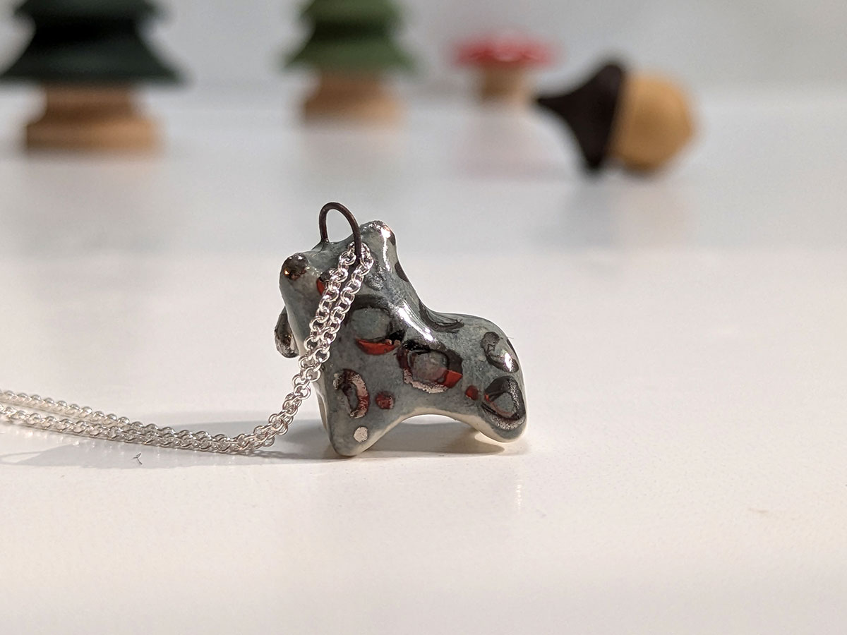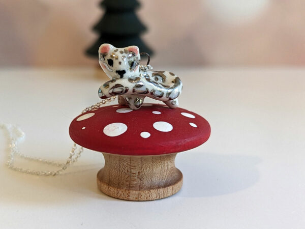 Petit pendentif de Panthère des neiges mordant sa queue, en porcelaine réhaussée d’or.