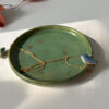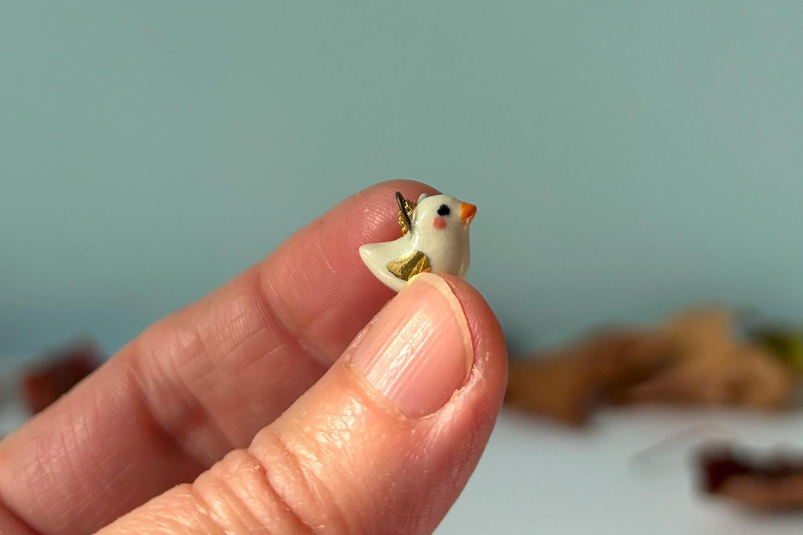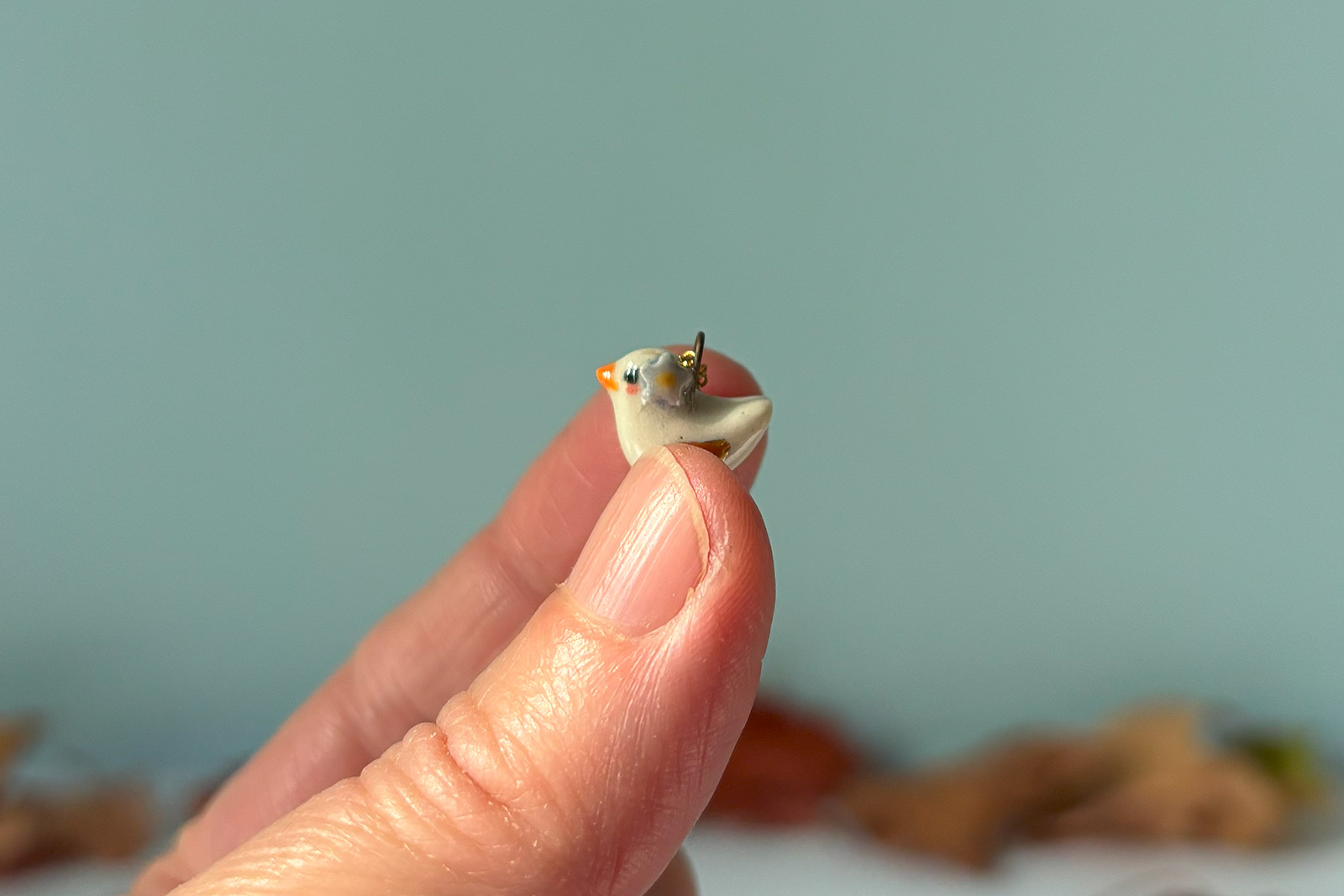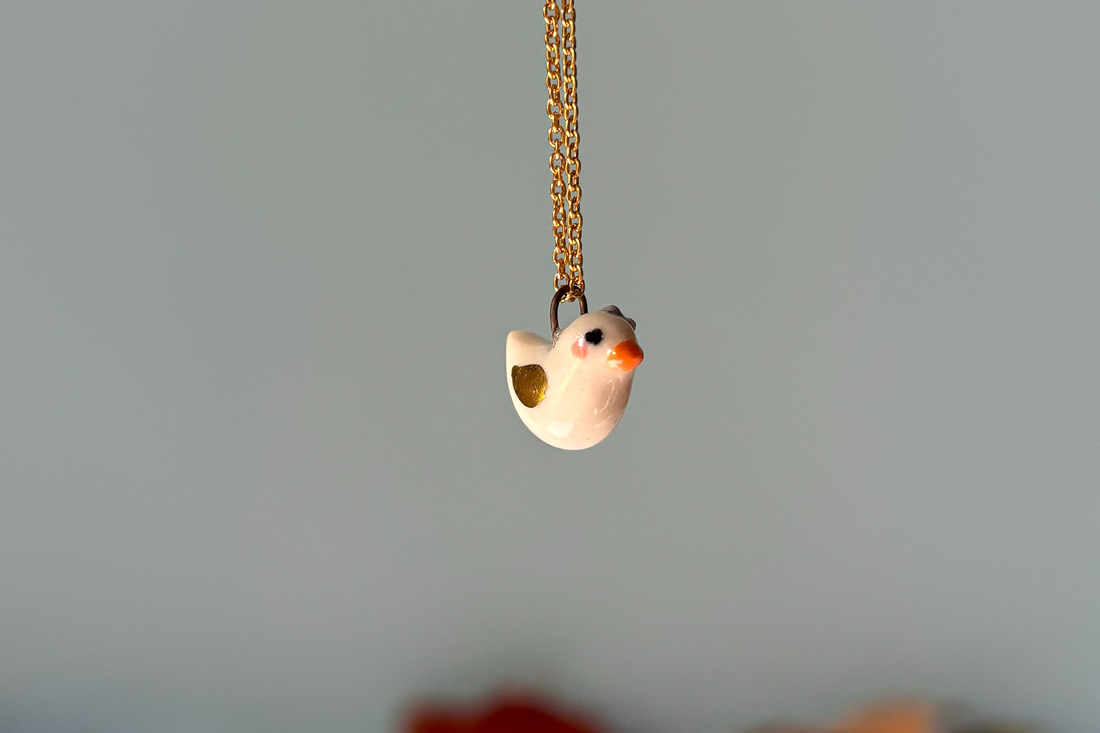 Petit pendentif de canard blanc avec des détails dorés, fait à la main. Il est livré dans une petite boîte illustrée.