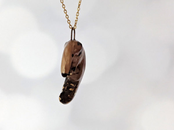 Pendentif de tamanoir en porcelaine, or et nacre. Environ 3 cm de haut. Pièce unique modelée à la main au Québec.