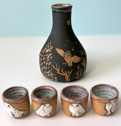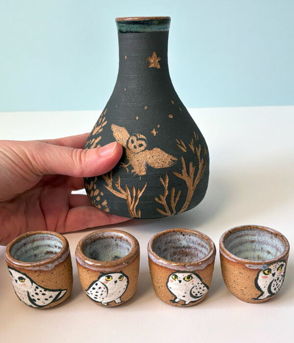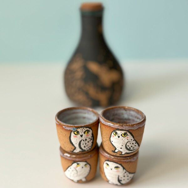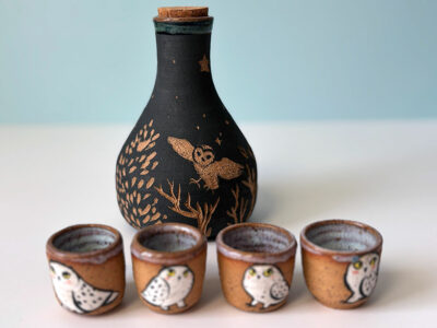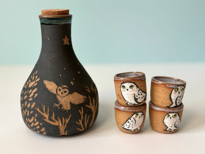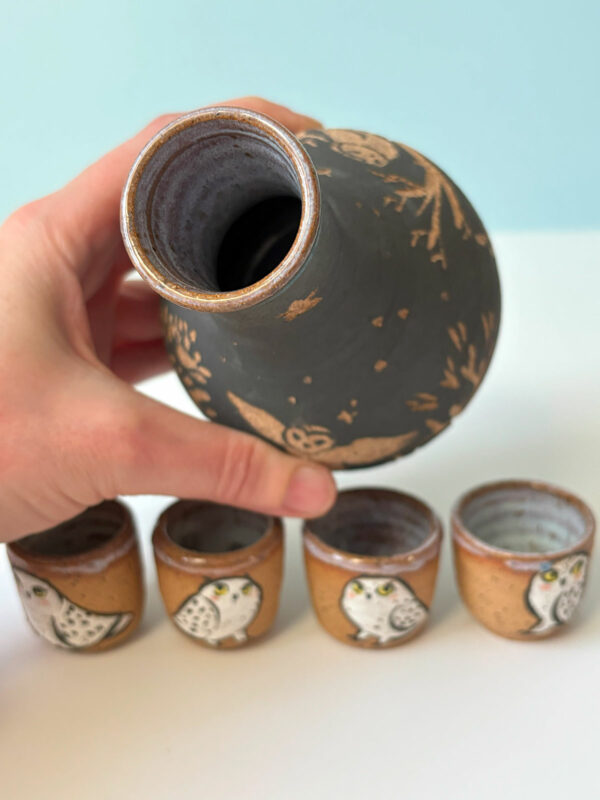 Voici un ensemble composé d’une petite carafe – environ 9-10 cm de large et 12-14 cm de haut, avec un bouchon en liège et 4 petits shots d’environ 3 cm de large et haut. Elle peut servir de bouteille de service pour le sake, le whisky ou tout autre délice de votre choix. Ce sont de petits contenants en grès moucheté émaillés à l’intérieur seulement. La bouteille est gravée et décorée à la main.