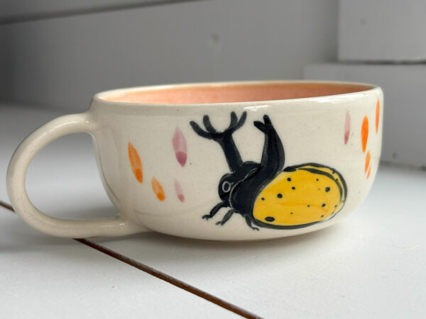 Adorable petite tasse à thé avec un coléoptère jaune. Cette tasse avec sa petite anse est faite entièrement à la main en porcelaine du Canada. Solide et mignonne, elle est parfaite pour l’heure du thé.