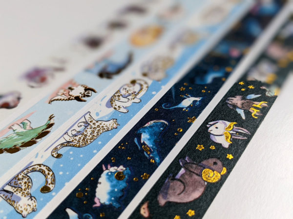 Washi tape aux motifs d’animaux mignons avec encre dorée, édités par The Washi Station. Ces rouleaux de washi tape sont disponibles en petite quantité sur The Washi Station principalement, avec beaucoup d’autres modèles réalisés par des artistes indépendants.